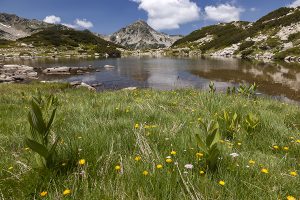 A lake and wild flowers in the Pirin Mountans in Bulgaria.