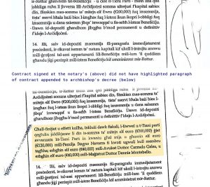 20/27 February 2017: The copy of the contract appended to archbishop’s decree specified who contributed what to that fund of €200,000 – 60% by the Stagno Navarras’, 20% each by the lawyer Carmelo Galea and retired magistrate Dennis Montebello – but that paragraph did not appear in the version of the contract signed at the notary’s office 7 days later.