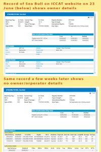 Similar questions were sent to ICCAT, which was also asked why ownership data for the Sea Bull had been removed from ICCAT’s website – on 23 June, ownership of the Sea Bull pertained to MFF Ltd, but at some point later, the ownership details no longer appeared.